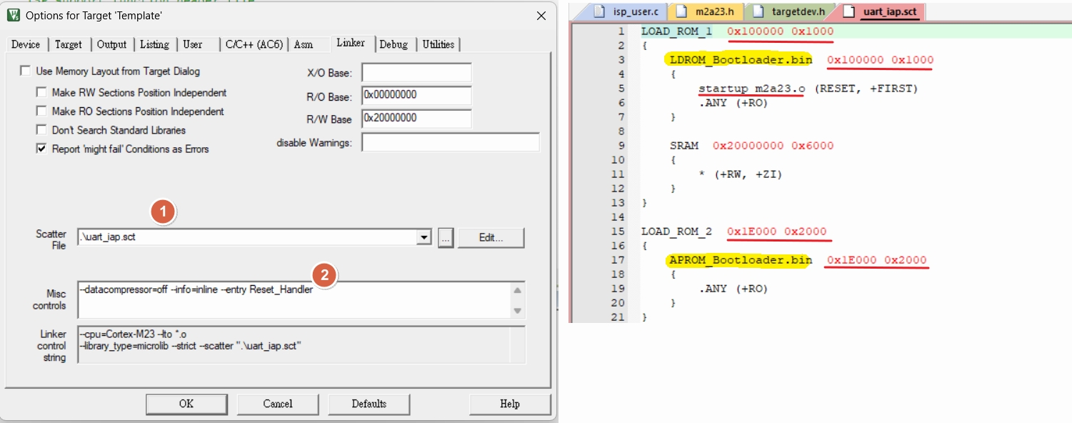 Boot code project uses a single scatter file: uart_iap.sct.