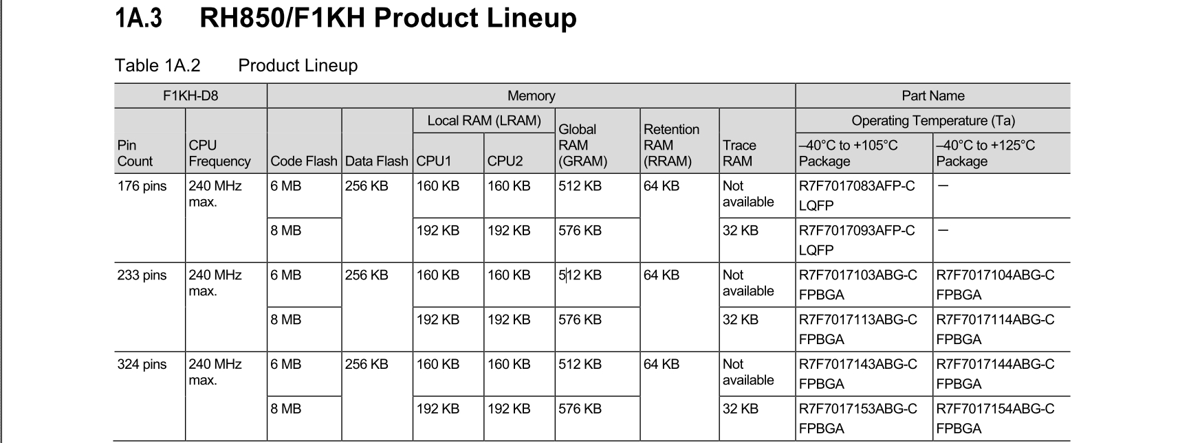| Series | Pin count | Code Flash size | LOCAL RAM(CPU1) | LOCAL RAM(CPU2) | RETENTION RAM(Bank B) | GLOBAL RAM(Bank A) | GLOBAL RAM(Bank B) | Part Name |